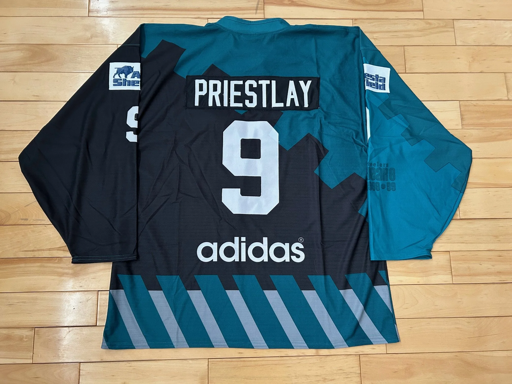Little is known about this jersey. It was gifted from one UK collector to another and then sold on to me in 2024. While Priestlay played in Pittsburgh for the previous two seasons (winning two Stanley Cups) he played in the IHL for the entirety of the 1992/93 season. Looking at the stitching, Stanley Cup patch and markings on the label and fight strap however, there is no doubt that this jersey was a part of the Penguins set for the season. It is also signed by Priestlay on the strap.